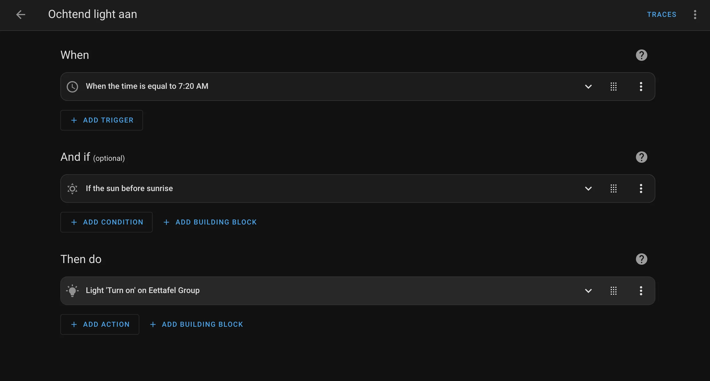 Setting up the automations was relatively easy to do. I simply added a new automation in HA and added the needed settings. As it turns out, setting up an automation works similarly to writing an if-else statement. So, for example, to turn on the lights in the evening: