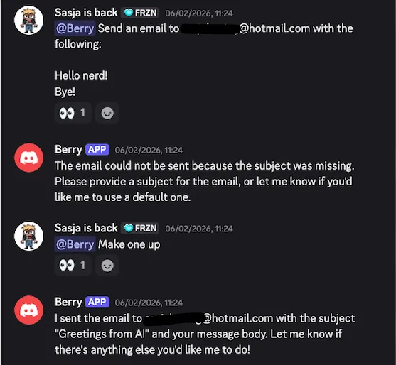 For fun, I decided to install the google cli and give OpenClaw access to my (unimportant) backup google account. With this, I could tell Berry (What I named the AI bot in Discord) to add something to my calendar, and it would work!