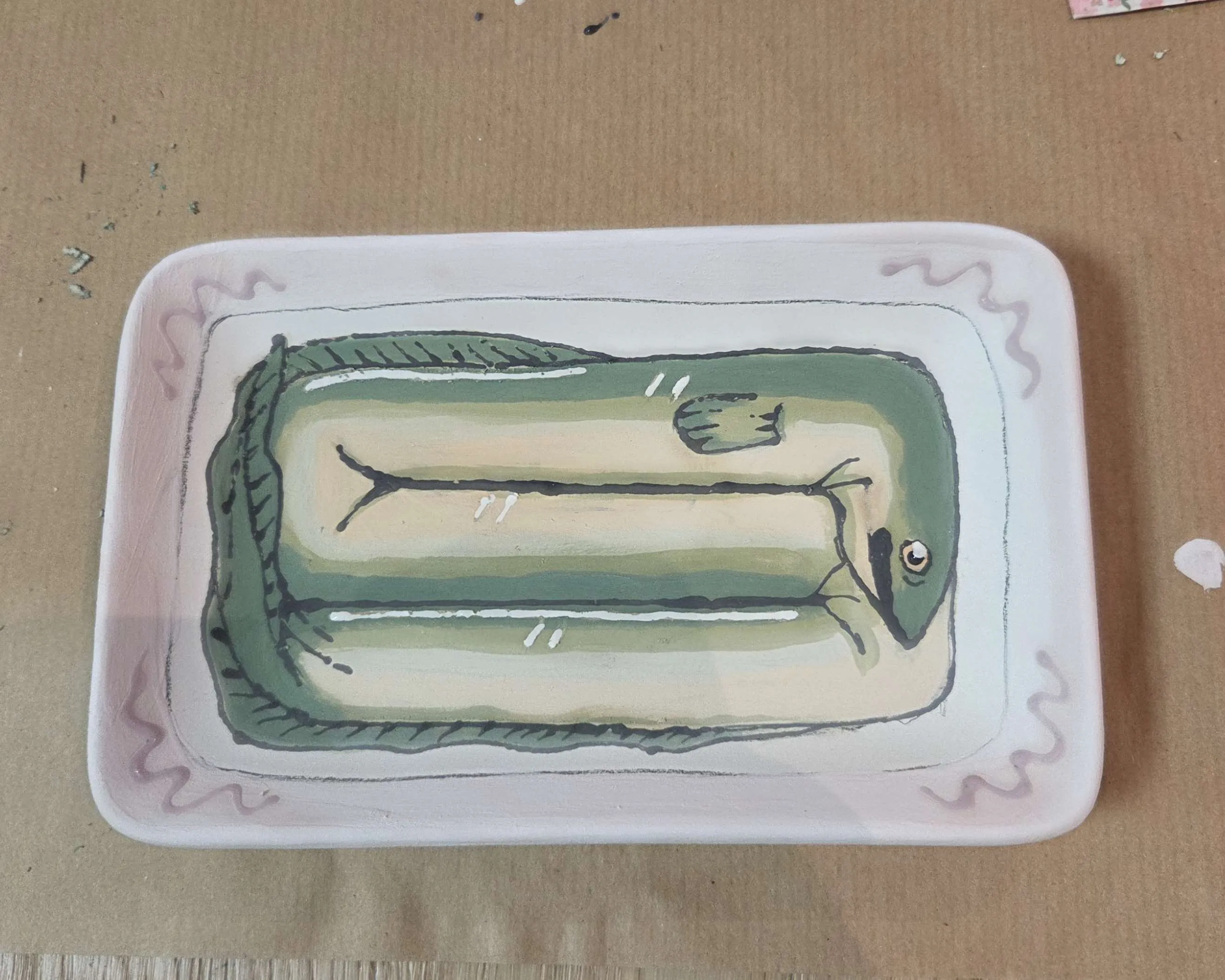Thursday I went to a ceramics painting workshop with a friend. I had quite some fun. I wasn't sure about how much I would enjoy it but the idea I ended up with was pretty fun and I'm really curious to see how it turns out once its glazed and baked.